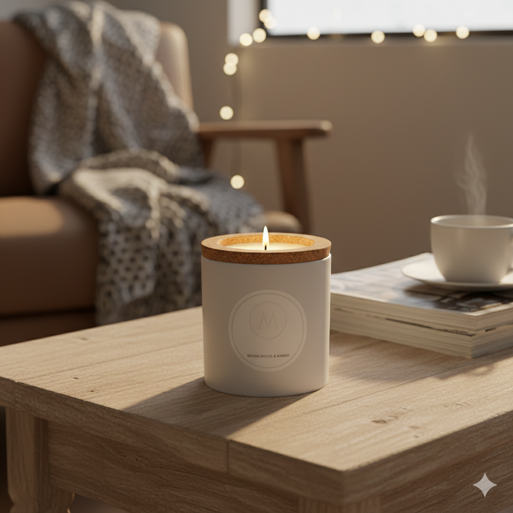 Letisztult illatgyertya egyedi címkével, ideális otthoni hangulatfokozáshoz vagy ajándéknak.